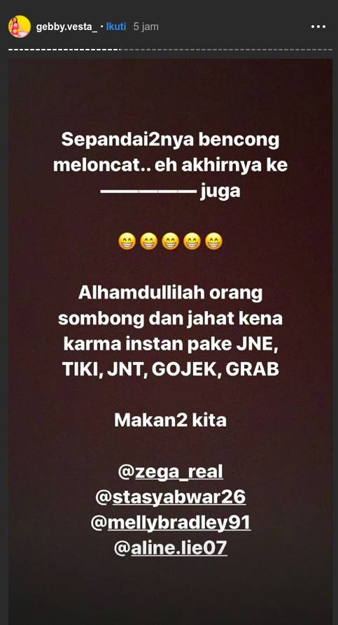 "Sepandai-pandainya bencong meloncat, eh akhirnya ke ______ juga. Alhamdulillah orang sombong dan jahat kena karma instan pake JNE, TIKI, JNT, GOJEK, GRAB," tulis Gebby Vesta.