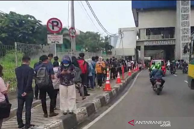 Sejak pukul 07.00 WIB antrean sudah "mengular" mencapai bagian luar dari Stasiun MRT Fatmawati. Penumpang yang masih sabar menunggu harus antre hingga mengisi ruang trotoar yang seharusnya digunakan oleh pejalan kaki.