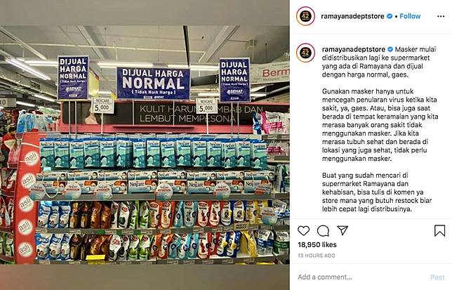 Ramayana mengunggah foto kemasan berisi dua buah masker seharga Rp 5.000 ketika harga di pasaran sudah mencapai Rp 30.000. "Per costumer hanya boleh beli 1 yah gaes. Bukan untuk diperjual belikan atau untuk distok. Mari kita utamakan yang sakit atau yang membutuhkan," tulis akun Instagram Ramayana.