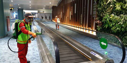 Chief Officer In Charge Bandara Soekarno-Hatta, Edi Rohadi mengatakan, terdapat 7 orang petugas yang diterjunkan untuk melakukan penyemprotan disinfektan di berbagai fasilitas publik.